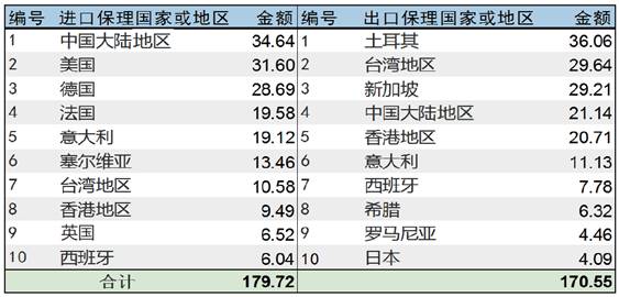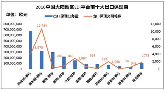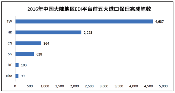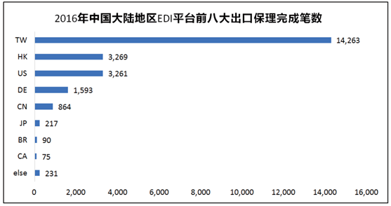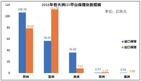 表1 2016年 EDI平台进口、出口保理前10的国家或地区 单位:亿欧元 数据来源:EDI平台,天逸金融研究院分析整理 上表也可以看出,进口和出口保理前 10 的国家或地区承做的进口保理业务、出口保理业务分别占全球保理业务总额的 90.01% 和 85.42%。可以看出FCI成员国的国际保理业务主要集中于这些国家或地区,与各国或地区的经济发展、国际贸易水平有着不可或缺的关系。 从各大洲 FCI 成员国经 EDI 平台的交易量来看,目前进口保理业务规模最大的是欧洲共同市场,有106.39 亿欧元;其次是亚洲,共 56.65 亿欧元。而EDI 平台交易的出口保理业务中,亚洲的交易规模最大,达到 111.78 亿欧元;其次是欧洲共同市场,为78.6 亿欧元。这与各大洲在世界经济中扮演的角色密切相关,欧洲和亚洲是保理业务发展较早的地区,而亚洲国家主要是一些发展中国家,在国际贸易中充当着重要的出口商的作用,而欧洲主要以发达国家为主,是国际贸易中主要的进口国。 数据来源:EDI平台,天逸金融研究院分析整理 图1 2016年各大洲EDI平台保理业务规模 EDI 平台中注册的亚洲地区成员国参与国际保理业务的国家或地区共有 16 个,其中承做进口保理业务位居前 5 位的国家或地区主要有中国大陆地区、台湾地区、香港地区、日本和泰国,承做出口保理业务位居前 5 位的国家或地区主要有台湾地区、新加坡、中国大陆地区、香港地区和日本。 表2 2016年亚洲排名前5的进口、出口保理业务国家或地区 单位:亿欧元 数据来源:EDI平台,天逸金融研究院分析整理 从 FCI 公布的 2016 年保理业务数据来看,中国大陆地区 2016 年保理业务共完成 2,646.6 亿欧元,占全球保理业务的 11.24%,其中国内保理业务1,899.49 亿欧元,国际保理 747.1 亿欧元。而 EDI 平台上可获得的注册保理商的交易数据为进口保理34.64 亿欧元,出口保理 29.64 亿欧元,占中国大陆地区国际保理业务的比例较小,说明中国大陆地区有大部分保理公司的进出口交易数据未能有效统计。 从 2016 年 EDI 平台可获得的数据来看,中国大陆地区的出口保理业务中,股份制 A 银行业务量最大,其次是股份制 B 银行。而从出口保理业务的交易笔数来看,全年共完成 28,363 笔,其中股份制 B 银行的交易笔数最多,达 10,734 笔;其次是是股份制A 银行,共完成出口保理 3,970 笔。 数据来源:EDI平台,天逸金融研究院分析整理 图2 2016年中国大陆地区EDI平台前十大出口保理商 从EDI 平台上 2016 年中国大陆地区的进口保理业务规模来看,业务规模最大的是国有 G 银行,其次是国有 K 银行。而从交易笔数来看,全年共完成进口保理 8,556 笔;其中国有 F 银行交易笔数最多,达 5,506 笔,其次是外资 E 银行,完成 866 笔。 数据来源:EDI平台,天逸金融研究院分析整理 图3 2016年中国大陆地区EDI平台前十大进口保理商 经 EDI 平台交易的中国大陆地区出口保理业务中,主要的进口保理商来自台湾地区、香港地区、美国等国家或地区,从完成交易的笔数来看,与台湾地区的进口保理商共完成 14,263 单保理业务,与香港地区的进口保理商共完成 3,269 单保理业务,而与美国的进口保理商共完成了 3,261 单保理业务。 数据来源:EDI平台,天逸金融研究院分析整理 (注:TW—台湾地区,HK—香港地区,US—美国,DE—德国,CN—中国大陆地区,JP—日本,BR—巴西,CA—加拿大) 图4 2016年中国大陆地区EDI平台前八大出口保理完成笔数 而经 EDI 平台完成的中国大陆地区进口保理业务中,主要的出口保理商来自台湾地区、香港地区、美国等国家或地区,其中与台湾地区的出口保理商共完成 4,637 单保理业务,与香港地区的出口保理商共完成 2,225 单保理业务。基本可以看出近年来中国大陆地区的进出口保理业务的主要流向和趋势。 数据来源:EDI平台,天逸金融研究院分析整理 (注:TW—台湾地区,HK—香港地区,CN—中国大陆地区,SG—新加坡,DE—德国) 图5 2016年中国大陆地区EDI平台前五大进口保理完成笔数 此次的数据仅以 EDI 数据交换平台上可获得交易数据为主,有很多保理公司的交易数据暂时未能获取。但从上文的分析也基本可以看出,中国大陆地区和亚洲乃至全球的通过 EDI 数据交换平台的保理业务交易规模、交易笔数和 2016 年主要的交易国家或地区,仅据此进行的一个简要分析。 本文来源:中金智库