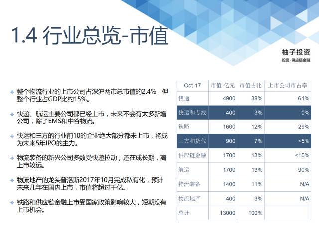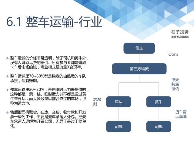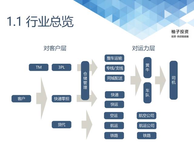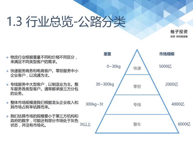 2016年底,快递巨头成功借壳上市,顺丰更曾是深圳股市的市值第一名。快递行业规模约5000亿,但它只是整个物流行业的4%。整个物流行业占到GDP的15%,公路物流约7万亿。这个体量是TMT的3倍,医药健康的2倍。如此这么庞大的行业却一直不被人所了解。本报告旨在对公路物流行业进行全面梳理和呈现,但受篇幅限制,本报告不包含大宗商品物流、特种物流、危险品物流和物流地产等。