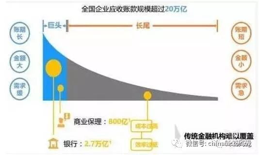 如上图所示,全国企业的应收账款有20万亿,银行仅仅关注了大企业的2.7万亿,大量长尾巴的中、小企业的融资需求,银行却视而不见的现象屡见不鲜。如果把小物流企业的碎片融资需求集约起来,市场巨大。