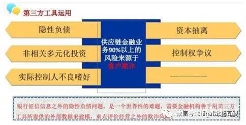 4、管理信用的风险,特别是要利用第三方的反欺诈的工具,我认为供应链金融业务,90%以上的风险来自于客户的欺诈,包括控制权的争议、资本的抽离、隐性负债等等。