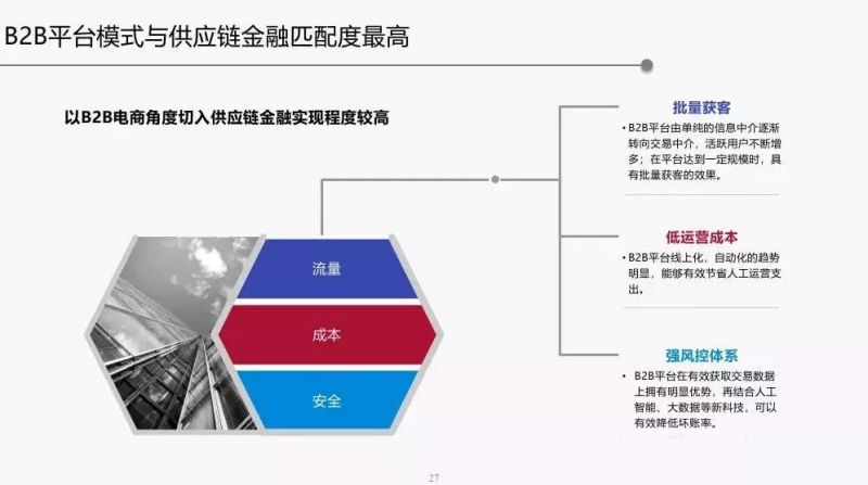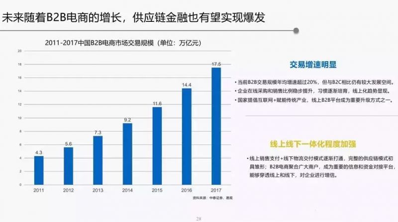B2B平台模式与供应链金融匹配度最高,未来随着B2B电商的增长,供应链金融也有望实现爆发。
