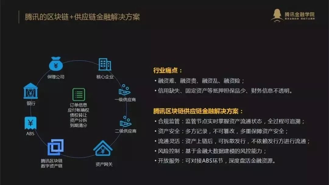 以腾讯区块链技术为代表的金融科技落地供应链金融,为供应链金融的发展提供了强大技术支撑。通过区块链连通供应链中的各个公司/机构,完整真实地记录资产(基于核心企业应付账款)的发行、流通、拆分、兑付。由于区块链上的数据经多方记录确认,不可篡改,不可抵赖,可以追溯,从而实现应收账款的拆分转让,全部能够追溯至登记上链的初始资产。通过技术实现供应链金融中的信任穿透机制,将原本不可拆分的应收账款数字化,提升资产流动性,降低中小企业的融资成本,深度盘活金融资源,承接国家战略,促进供给侧改革。