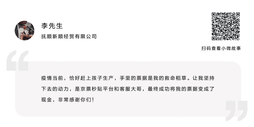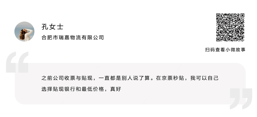 直到从其他公司财务朋友那里了解到京票秒贴,不到1小时完成了票据融资后,公司的现金流状况才有所缓解,算下来比其他渠道节省了6000多元!