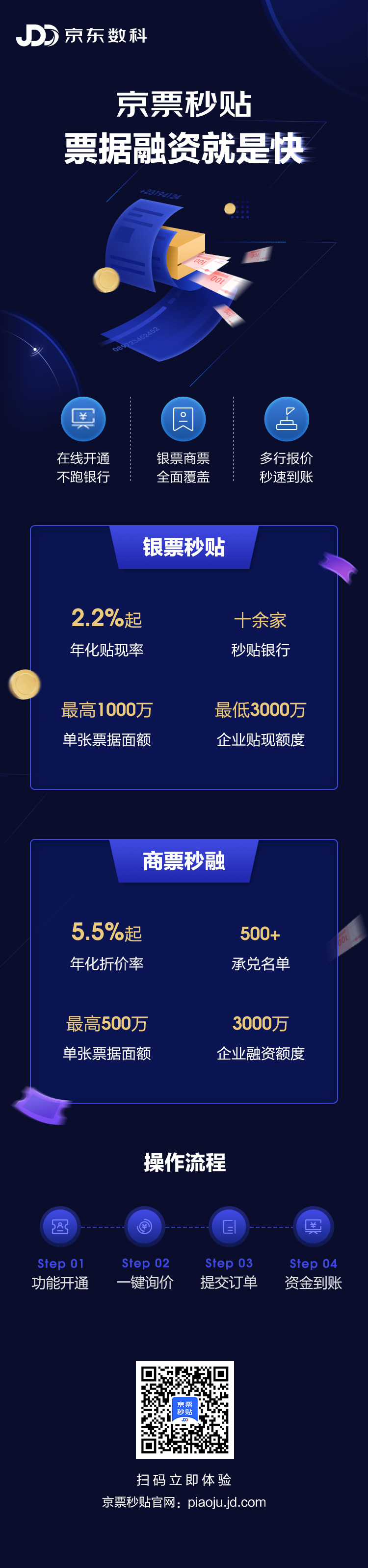 京票秒贴是京东数科旗下票据平台,支持银票秒贴和商票秒融,为中小微企业提供更高效、便捷、合规的票据融资服务,服务实体经济发展。